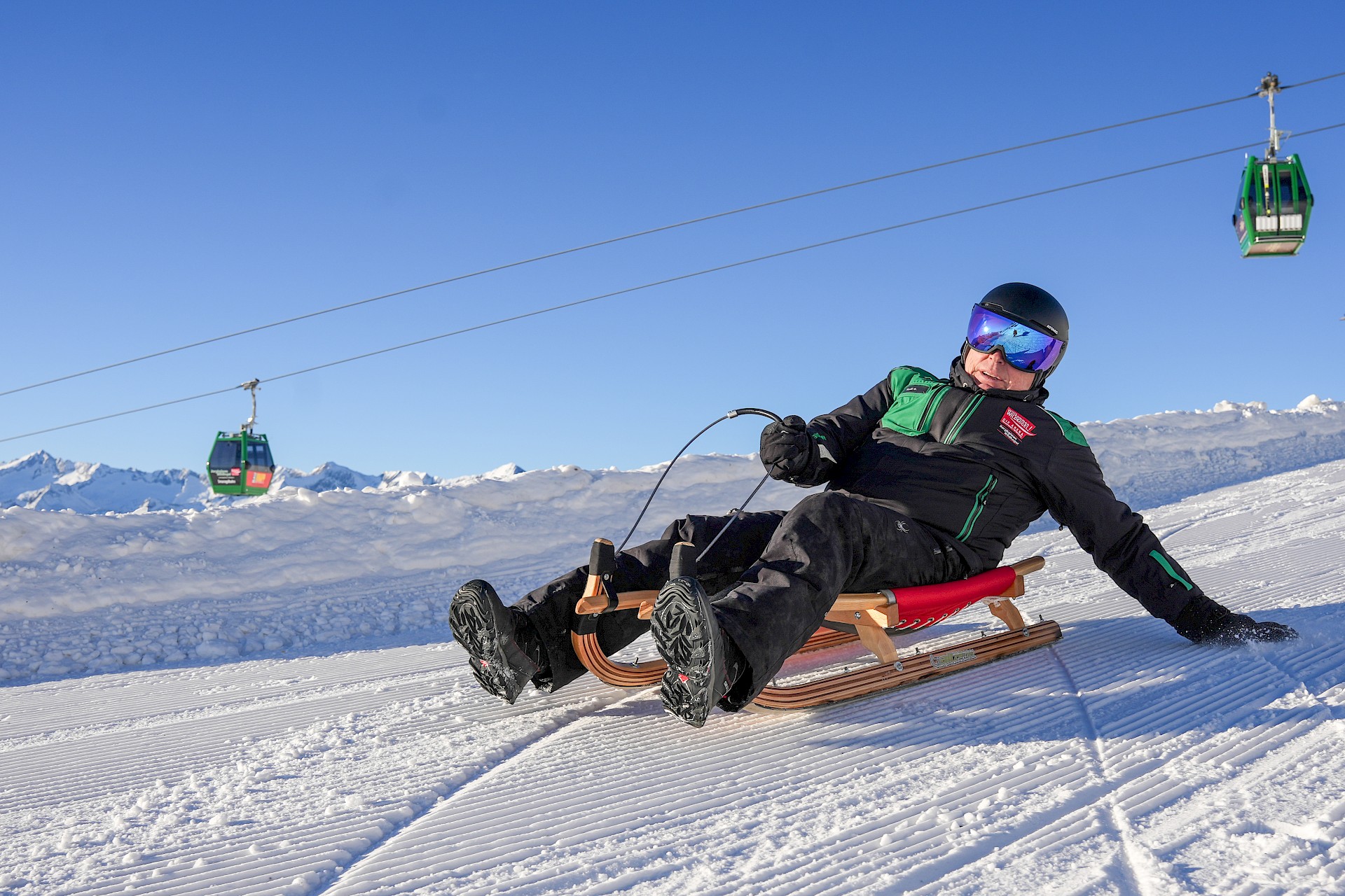 Heute muss man seinen Schlitten nicht selbst den Berg hinaufziehen. Es geht ganz komfortabel und bequem mit der Smaragd- oder der Wildkogelbahn hinauf zum Start der bestens präparierten Rodelbahn. In der Wildkogel-Arena wartet sogar die längste beleuchtete Rodelbahn der Welt auf alle Freunde der Kufengaudi. Die unglaubliche Länge von 14 Kilometern verspricht Kurve um Kurve echtes Rodelvergnügen – verlangt aber durchaus etwas Kondition und Technik von den Rodlern. Was den Pinzgauern, die oft schon im Windelalter erstmals am Schlitten saßen, völlig intuitiv in Fleisch und Blut übergegangen ist, sorgt bei Rodel-Novizen für so manches Fragezeichen. Wo sitze ich? Was mach ich mit den Füßen? Wie lenke ich und überhaupt – wie bremse ich?