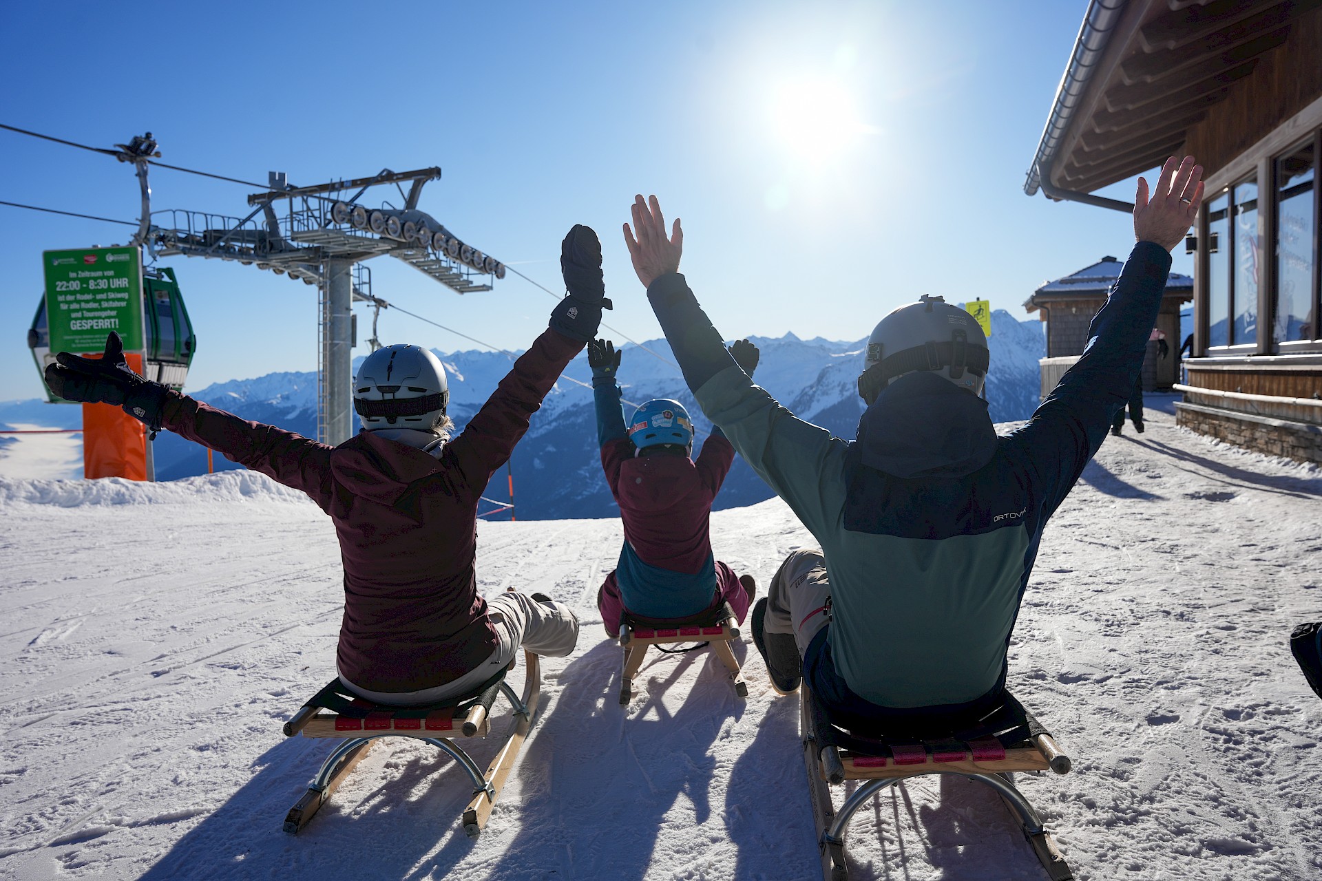 Wir setzen uns nun auf die Rodel, schließen den Helm und schieben die Brille auf die Nase. Bevor Rudi Göstl das Startzeichen gibt, hat er noch einen letzten Tipp: „Ganz wichtig! Vergiss nicht, dir zwischendurch mal Zeit zu nehmen, um in Ruhe das unglaubliche Panorama in den Nationalpark Hohe Tauern zu genießen!“ Noch bevor ich antworten kann, saust er mit einem Lachen davon und ich stoße mich fest mit den Beinen ab, um diesen unerlaubten Frühstart in den nächsten 14 Rodelkilometern wett zu machen.