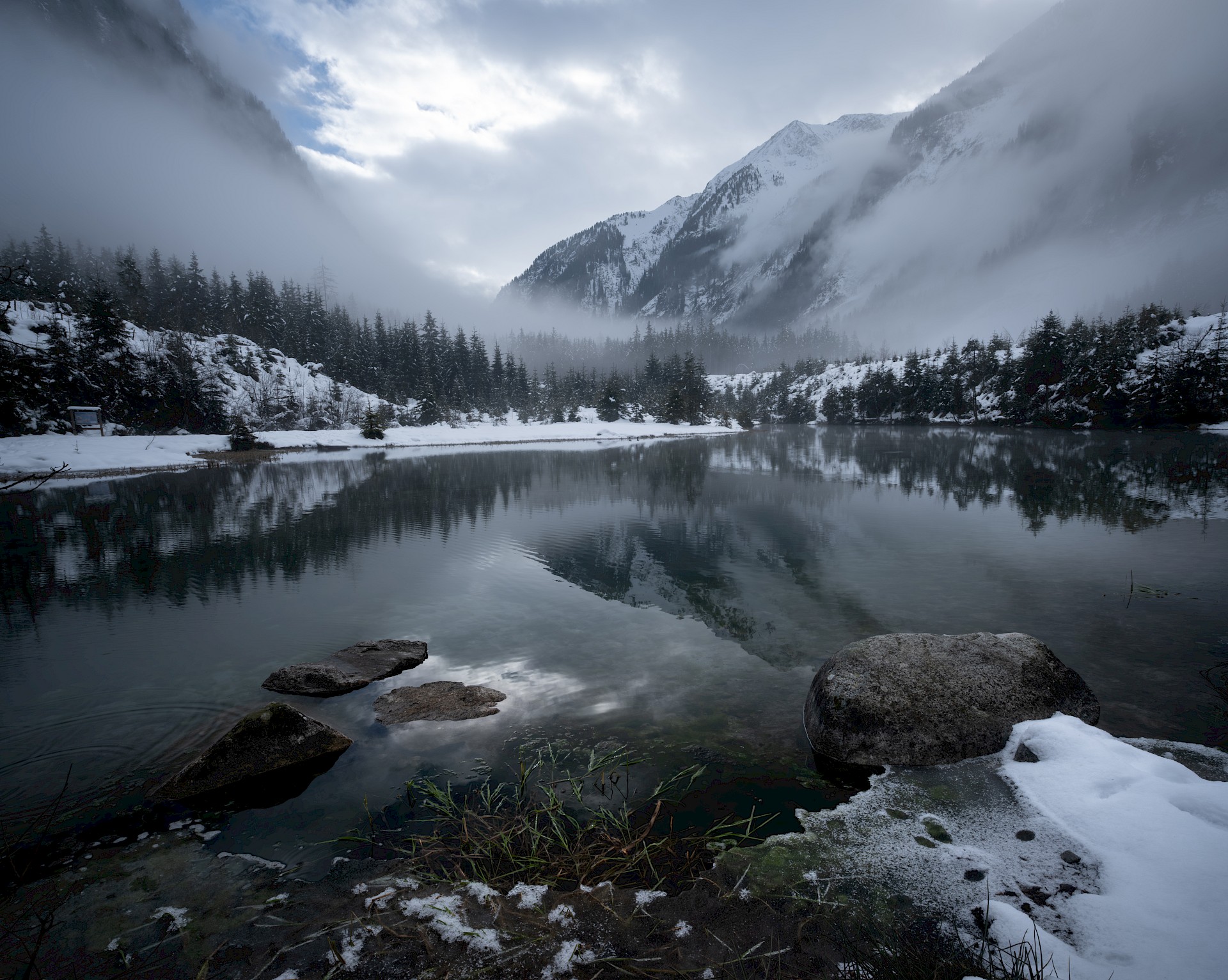 • Verschneiter Bergsee in den Alpen mit spiegelglatter Wasseroberfläche, umgeben von schneebedeckten Bergen, dunklem Nadelwald und tiefhängenden Wolken an einem ruhigen Wintertag.