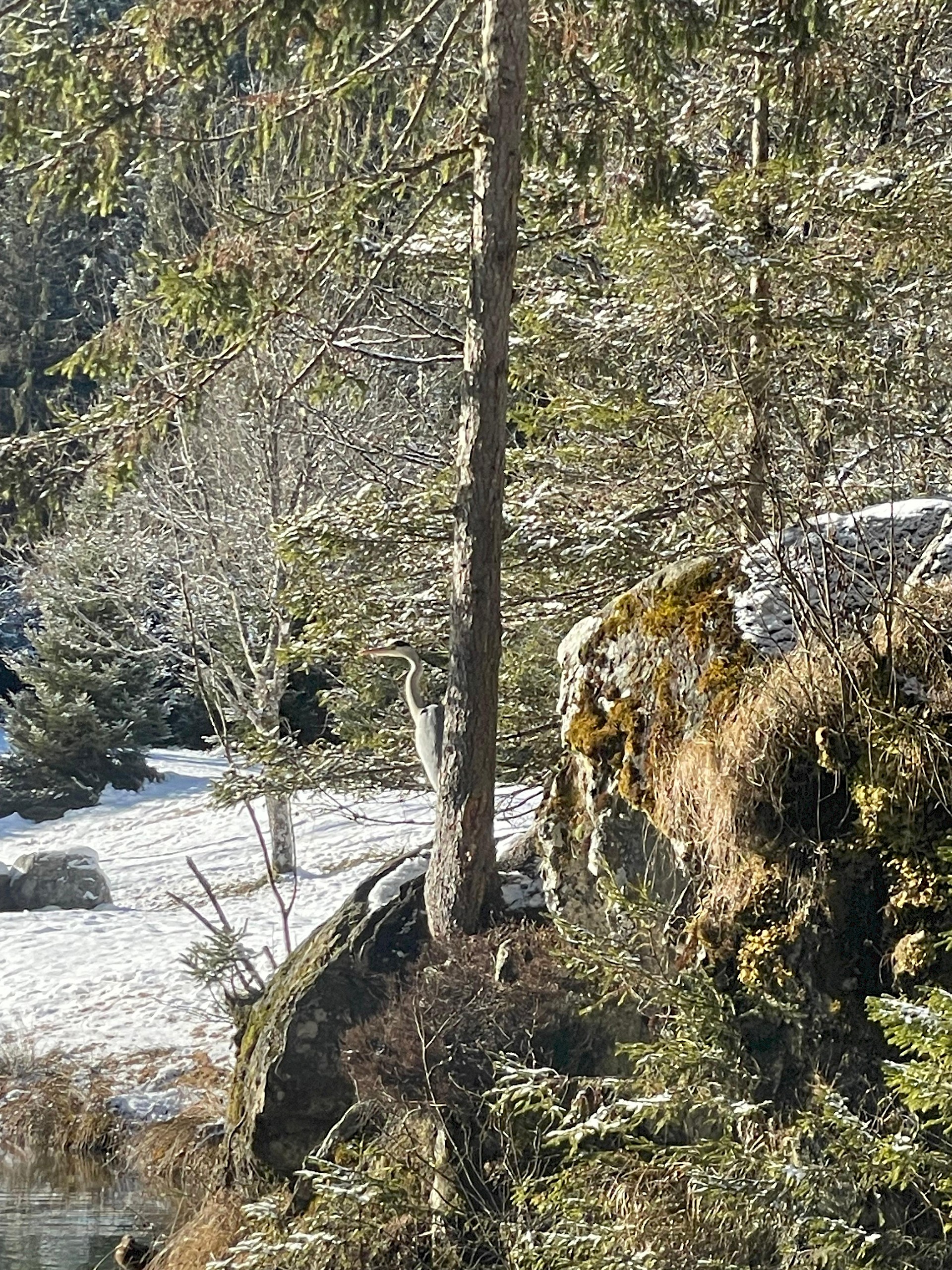 • Sonnenbeschienener Waldrand im Winter: ein schlanker Baum steht auf einem moosbewachsenen Felsen, daneben Schnee auf dem Boden, im Hintergrund lichte Bäume und eine ruhige, alpine Waldlandschaft.
